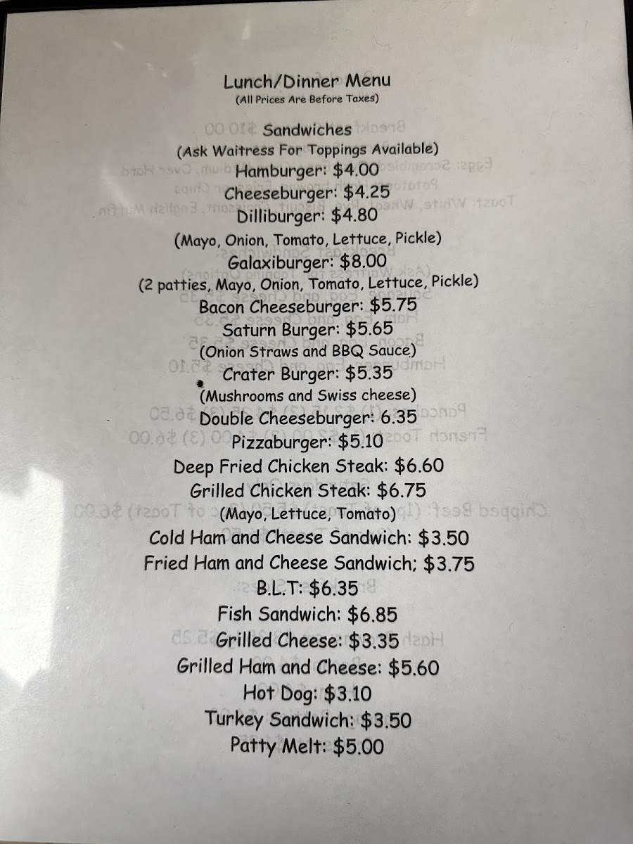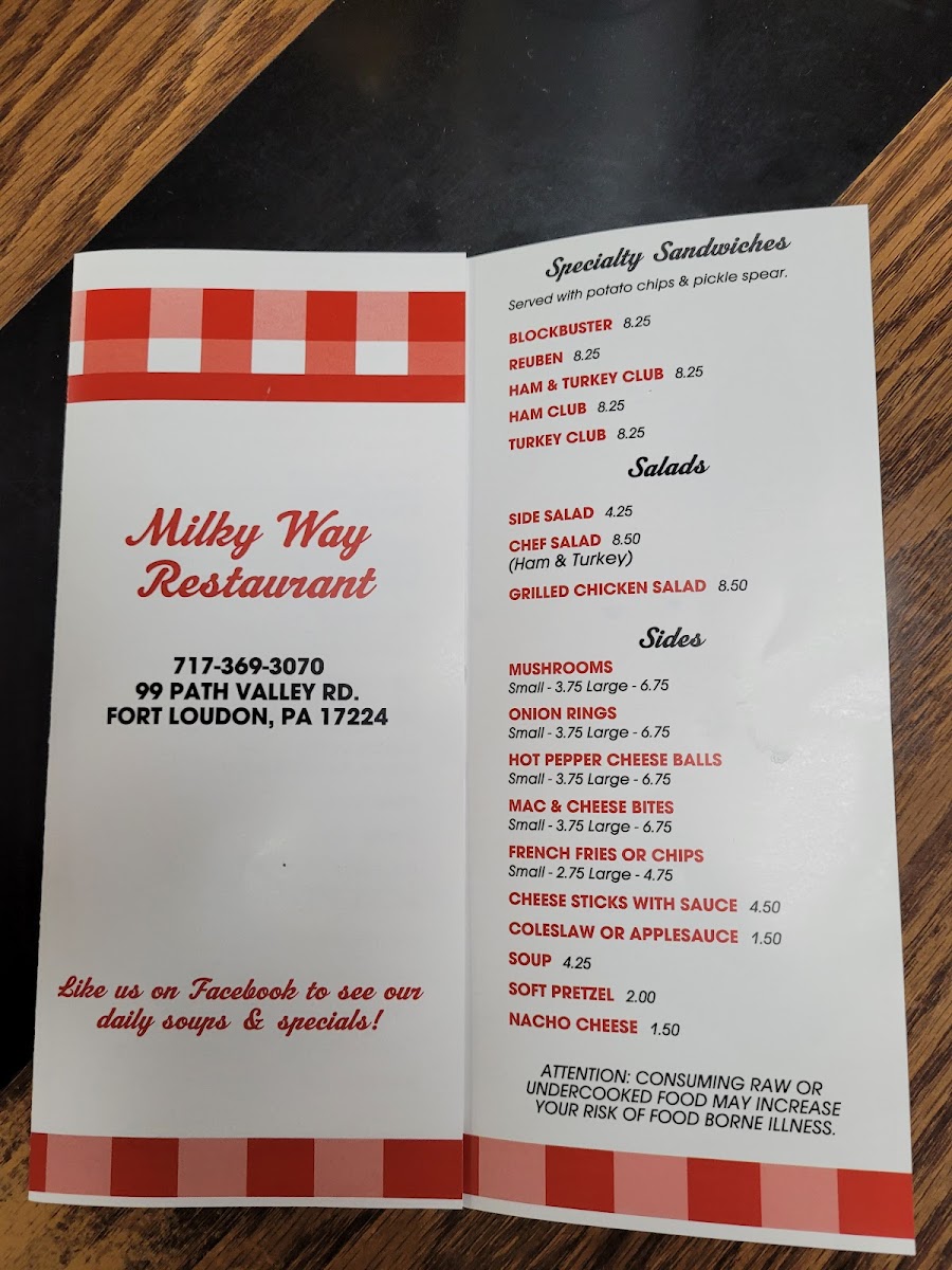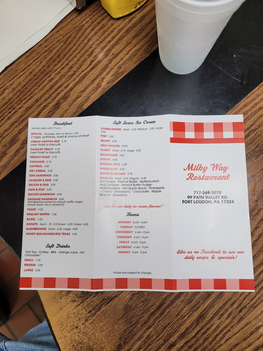 **About Milky Way Restaurant**Nestled in Fort Loudon, PA, Milky Way Restaurant is a beloved family-run diner famed for its comforting, made-to-order meals and warm service. Specializing in hearty breakfasts and specialty sandwiches, guests rave about the mouthwatering Reuben and various club options. The breakfast menu dazzles with favorites like French toast and creamy chipped beef. Notably, the soft serve ice cream has earned a fanbase, with treats like sundaes and banana splits taking center stage. Despite its vintage decor, the lively atmosphere and delicious food create an inviting experience, making it a must-visit gem for travelers and locals alike.